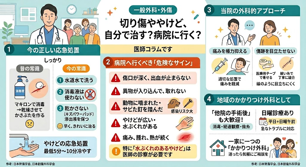 日常の料理やDIY、子供の外遊びなど、ちょっとした油断から起きる「切り傷」や「やけど」。ドラッグストアの絆創膏で自分で治そうとして、痛みが続いたり、酷い傷跡が残ってしまったりした経験はありませんか?当院の一般外科では、痛みを極力抑え、傷跡を目立たせないための専門的な処置を行っています。本記事では、家庭でできる正しい応急処置の基本と、外科を受診すべき怪我の見極め方について解説します。