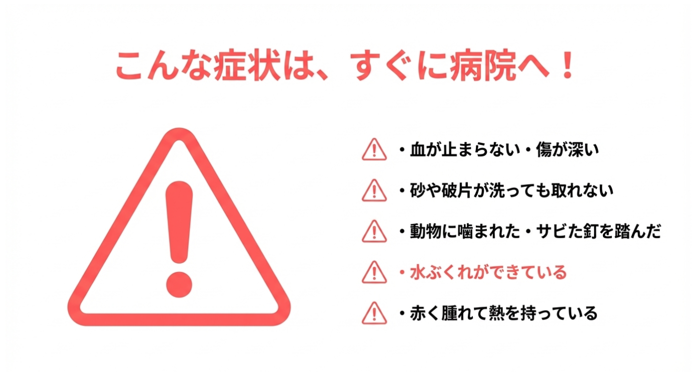 ・ 数日たっても痛みが引かない、傷の周りが赤く腫れて熱を持っている(感染・化膿のサインです)