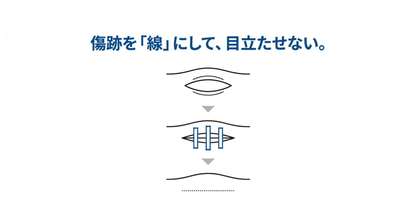 傷がどのように治っていくかを見極めるのは外科専門医の腕の見せ所です。傷口がパカッと開いているものは、医療用のテープで寄せたり、細い糸で丁寧に縫合したりすることで、将来的に傷跡が線のように目立ちにくくなるよう最善を尽くします。