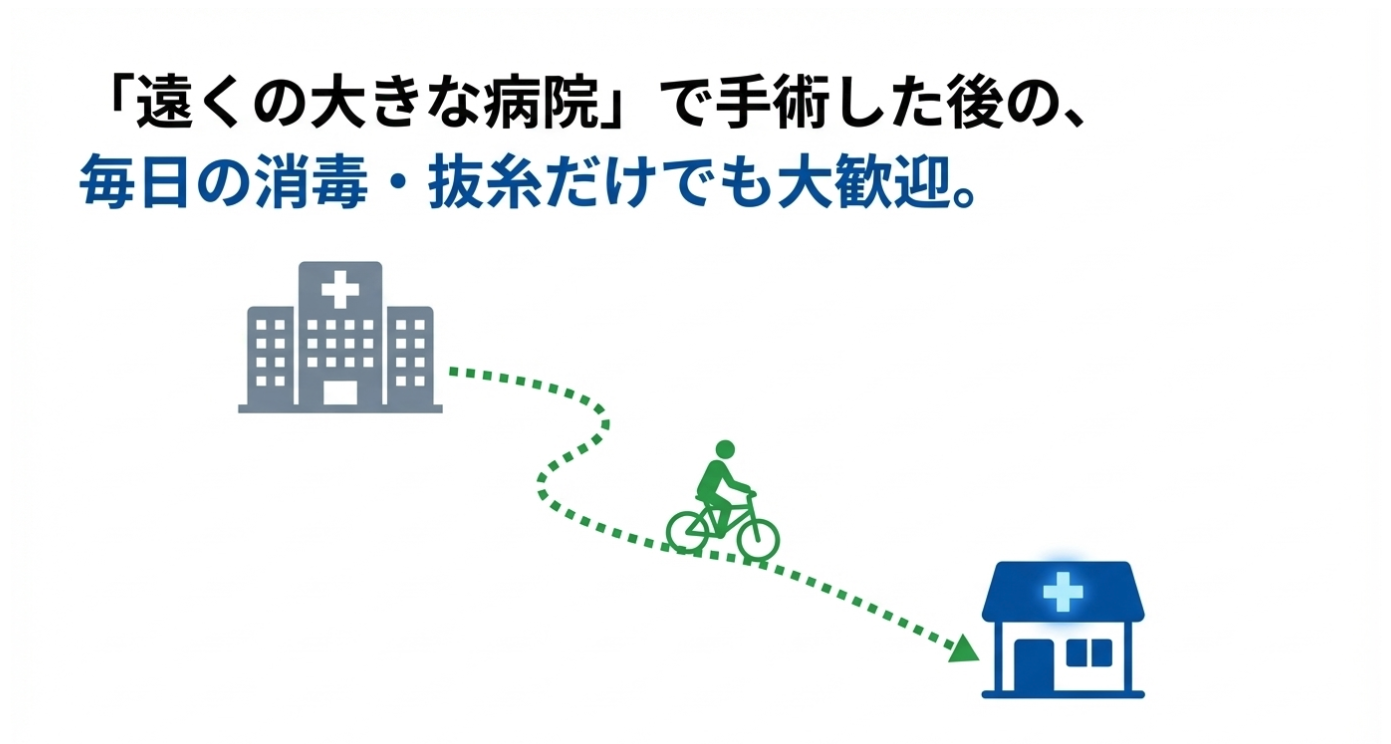 例えば、「遠くの大きな総合病院で手術を受けたけれど、その後の毎日の傷の消毒や、経過観察、抜糸のためだけに、わざわざ1時間かけて大病院に通うのはとても大変だ」というお悩みは非常によく聞かれます。