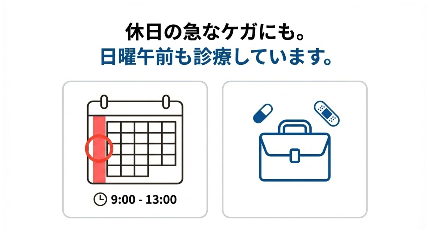 当院では平日だけでなく【日曜日の午前診療(9:00〜13:00)】も行っております。救急科専門医として数々の外傷を処置してきた院長をはじめ、経験豊富なスタッフが迅速に対応いたします。また、当院は内科診療も同時に行っているため、「怪我の治療で細菌感染を防ぐための抗生物質(飲み薬)」や「痛み止め」の処方も、患者様の持病や体質に合わせて安全に行うことが可能です。
